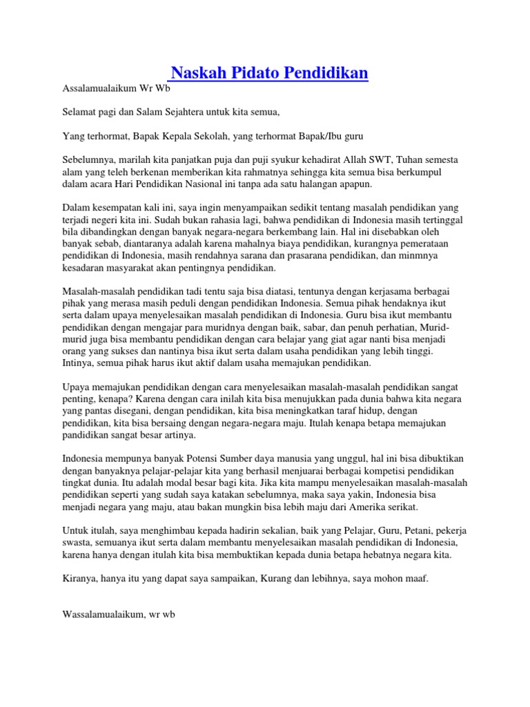 Hadirin yang saya hormati alhamdulillah puji syukur patut kita panjatkan karena sampai detik ini masih dikaruniai hidup dan kesehatan. Contoh Pidato Pendidikan Pendek. Ceramah Mengenai Pendidikan Yang Berkarakter.