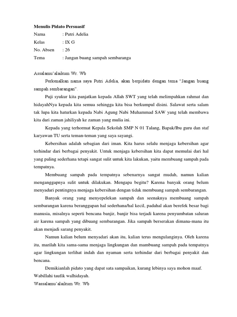Contoh pidato persuasif tentang jangan buang sampah sembarangan 17056971 1. Inilah pembahasan lengkap terkait contoh pidato persuasif tentang membuang sampah pada tempatnya. Pidato bahasa indonesia hidup bersih dengan tidak membuang sampah.