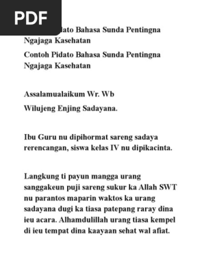 Pidato bahasa sunda ngajaga kasehatan terbaru. Pidato dalam bahasa sunda juga bertujuan untuk menyampaikan suatu gagasan kepada banyak orang atau di khalayan umum. Sateuacan sholat anu jadi ibadah utama kedah wudhu heula. Hal ini agar memudahkan anda untuk mempelajari teori dan contoh pidato.