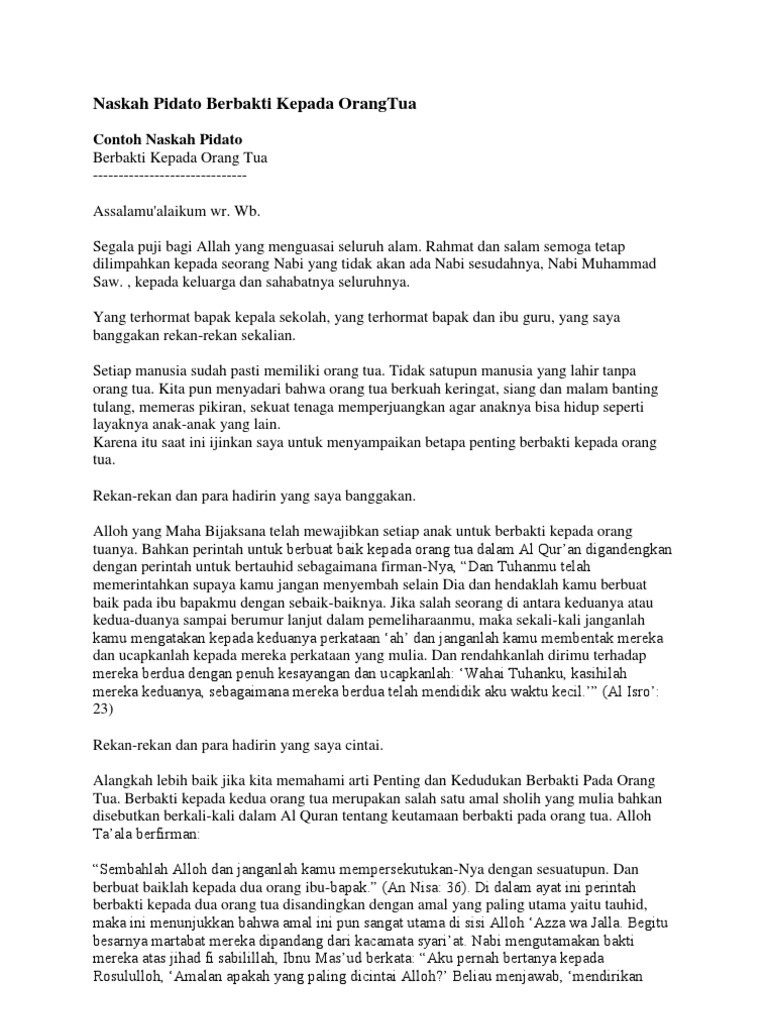 Sembahlah Allah dan janganlah kamu mempersekutukan-Nya dengan sesuatupun. Demikianlah teks pidato bahasa Indonesia tentang berbakti kepada kedua orang tua. Doc pentingnya menghormati orangtua makalah j.