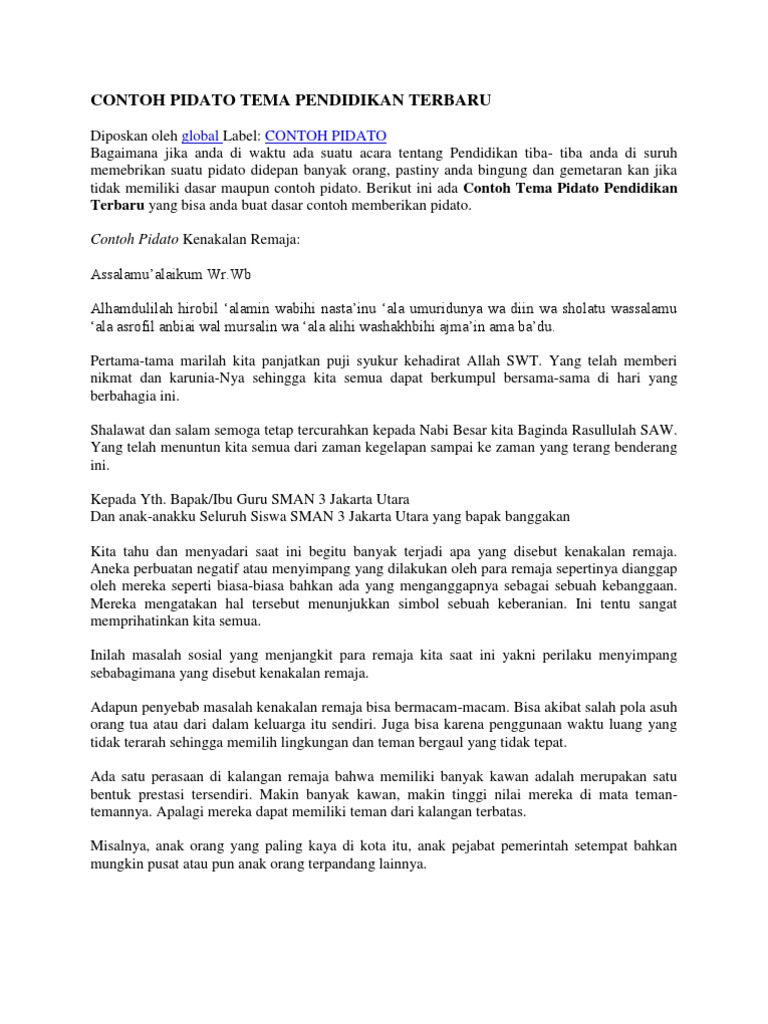 Contoh pidato dengan tema pendidikan bahasa indonesia Pidato memang kerap kali kita butuhkan dalam kehidupan apa lagi jika kita merupakan orang yang memiliki jabatan yang penting. Kumpulan Contoh Teks Pidato Berbagai Tema Berikut adalah kumpulan berbagai tema contoh teks Pidato Bahasa Indonesia yang menarik untuk Semua Kalangan. Teks Pidato Panjang Tentang Pendidikan.