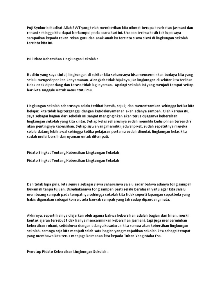Melalui pidato ini saya tidak akan membahas mengenai solusi bagaimana lingkungan sekolah yang bersih sehat dan nyaman akan terwujud. Maka kaum muslimin yaitu. Pidato Singkat Tentang Kebersihan 01 Naskah Pidato Assalaamualaikum WrWb Yang terhormat Ibu Hermarita SPd.