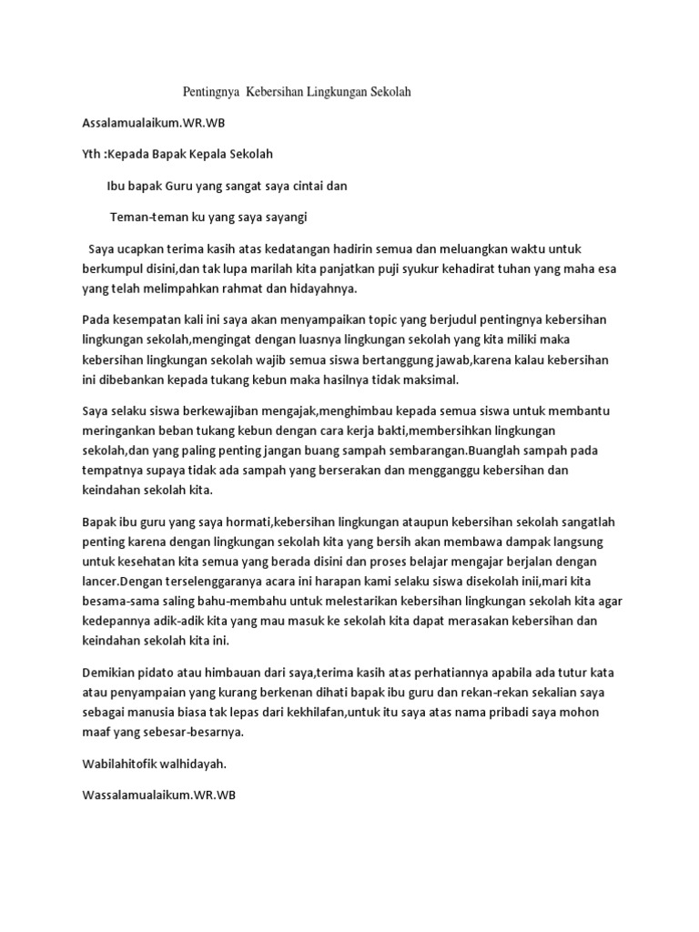 Seperti membuang sampah pada tempatnya dan tidak meninggalkan barang barang di laci karena dapat menjadi sarang nyamuk. Contoh pidato 1 kebersihan lingungan sekolah assaalamualaikum wr. Dengan tidak membuang sampah sembarangan kita telah berinvestasi pada kesehatan dan masa depan kita sendiri.