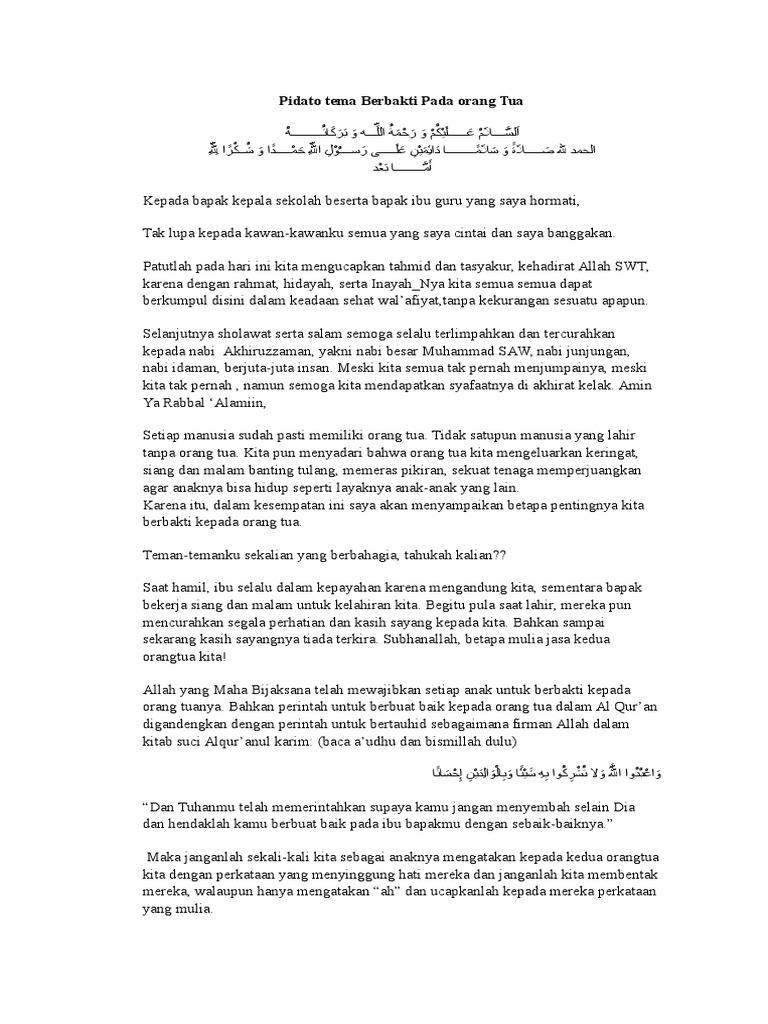 Contoh Pidato Berbakti Kepada Orang Tua Singkat. Pidato jenis ini bisa dibawakan di sekolah di kantor bahkan hingga di. Hamdan wa syukrollillah Asholatu wassalamu ala nibiyil musthofa muhammadin.