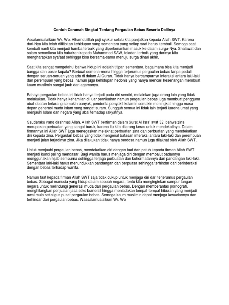 Teks ceramah singkat pergaulan bebas terbaru. Teks Ceramah Agama Islam Tentang Pergaulan Bebas Nurul Fadilah. Pada kesempatan ini saya hendak menyampaikan pidato mengenai kebebasan dalam pergaulan bebas. 6 contoh teks ceramah singkat terbaru 2021 tentang berbagai topik Pernahkah kamu diminta untuk melakukan ceramah di depan umum.