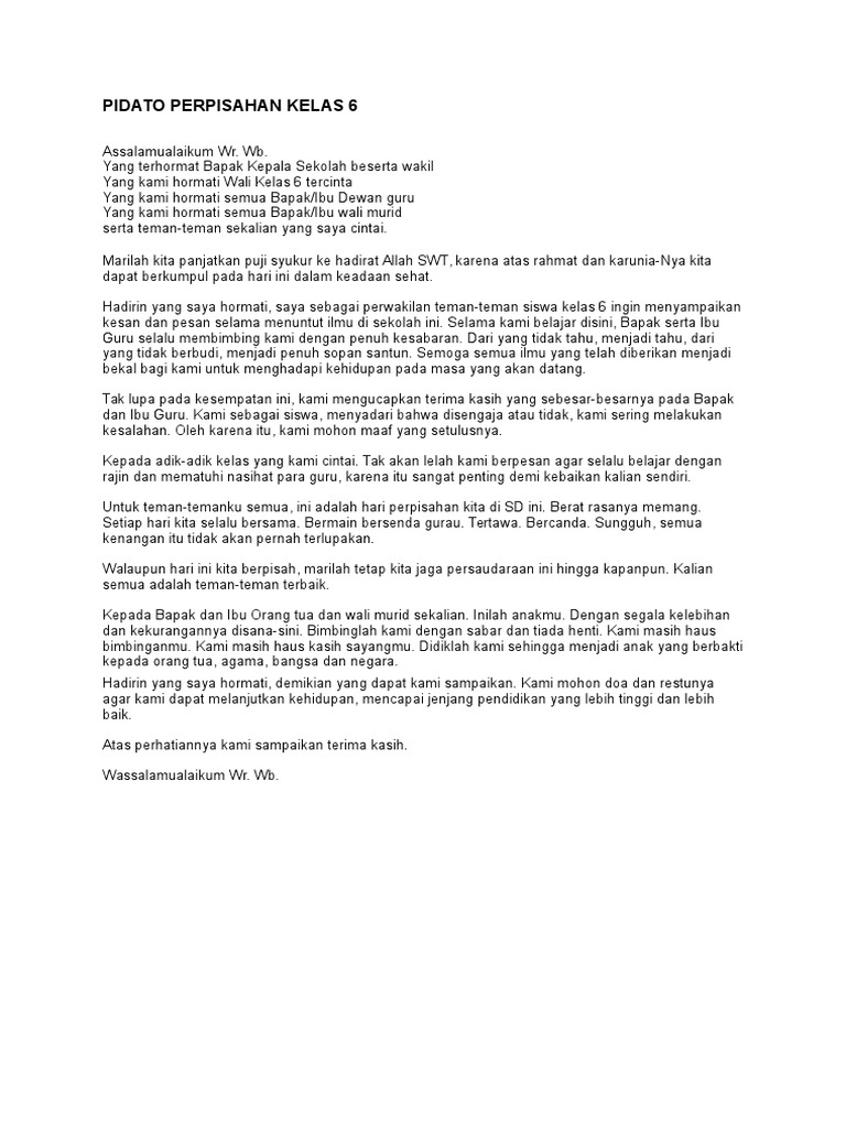 Selamat pagi salam sejahtera untuk kita semua. Pidato perpisahan kelas 6 adalah contoh teksnaskah pidato pendidikan menggunakan bahasa indonesia. Sebenarnya pidato bisa dilakukan siapa saja namun pidato biasanya di bawakan oleh seseorang yang begitu penting untuk menyampaikan suatu pada acara tertentu.