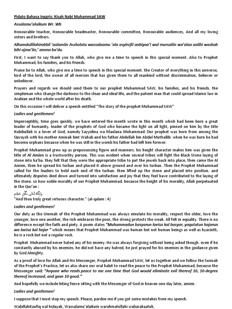 Pidato bahasa inggris maulid nabi the celebration of prophet muhammad saw maulid untuk disampaikan saat sambutan perayaan peringatan kelahiran nabi muhammad saw setiap tanggal 12 robiul awal tahun hijriyah. Teks Pidato Bahasa Inggris Maulid Nabi The Celebration of Prophet Muhammad SAW Maulid Assalamualaikum wrwb There are words worthy saying except to extend all the praise to Allah Swt due to all of his blessing mercy and guidance upon all of us so that we can still take the benefit from His blessing namely the good health and oxygen we breathe in without any need to cost anything. 21 Pidato Bahasa Sunda Biantara Dan Contoh Berbagai Tema.