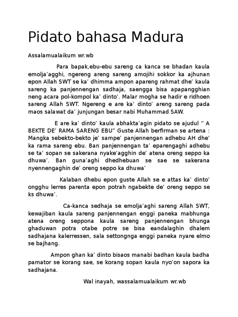 Tidak perlu dengan kata panjang ada pula beberapa contoh pidato. Contoh Pidato Bahasa Jawa atau Sesorah Kemah Pramuka. Pidato dalam bahasa madura dilombakan di malaysia antara news megapolitan Pidato 1 muharram bahasa madura.