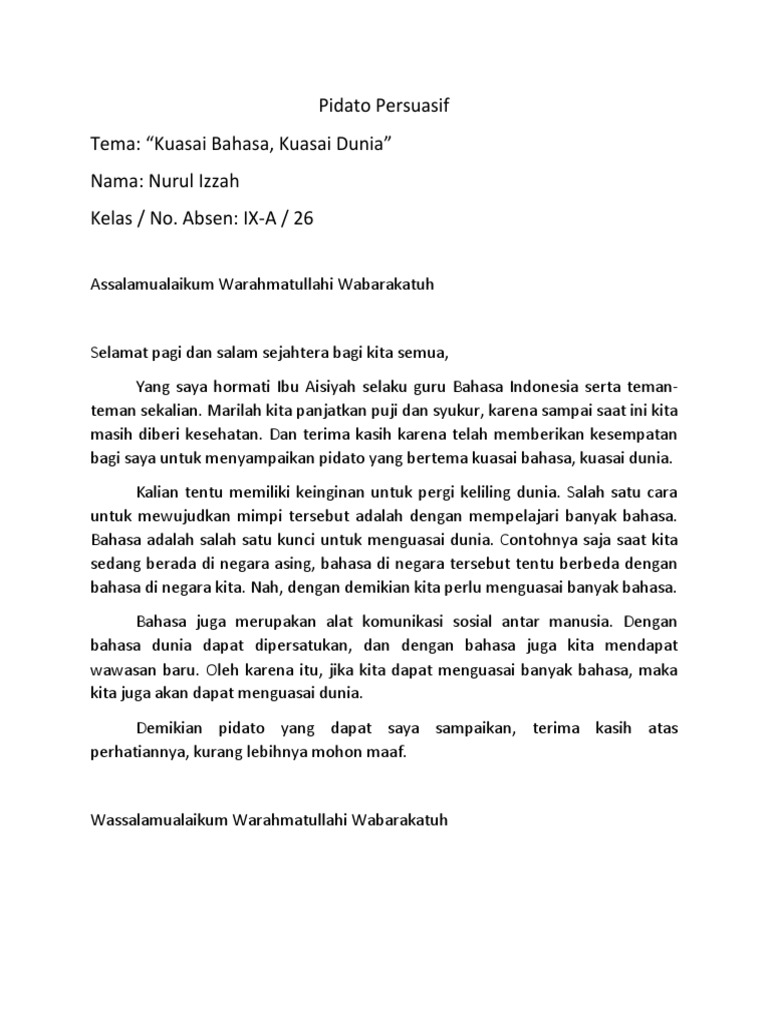 Pidato Persuasif Tentang Kuasai Bahasa Kuasai Dunia. Akhir kata Wassalamualaikum WrWb. Menulis Pidato Persuasif Tugas terakhir adalah berpidato secara spontan tanpa teks.