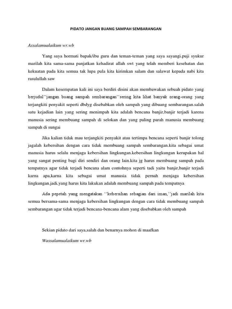 Dalam kesempatan kali ini Mamikos akan memberikan contoh naskah pidato tentang kebersihan lingkungan atau contoh pidato tema lingkungan. Universitas islam darul ulum lamonga Sebagaimana yang diketahui bahwa bapak ibu guru disekolah acapkali memberikan tugas kepada kita untuk berpidato. Homepage pidato singkat tentang kebersihan.