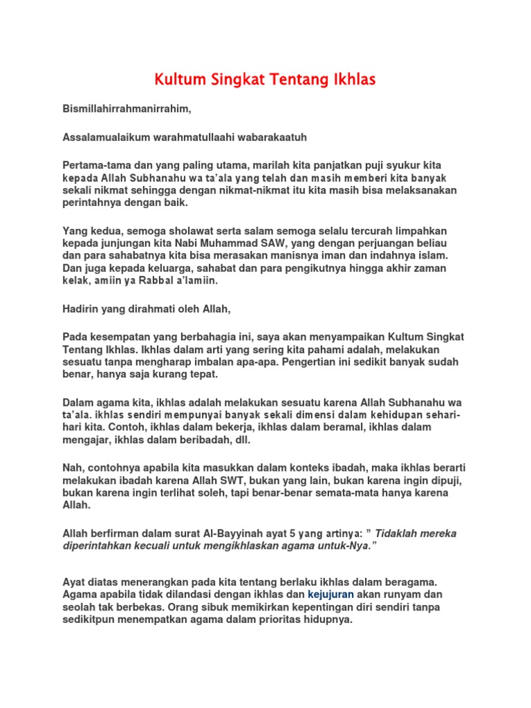 Ceramah Singkat Tentang Ikhlas Beserta Dalilnya - LENGKAP Mudah-mudahan kita menjadi Hamba Allah yang Mukhlisin Aamin ya Rabbal Alamin Itulah dapat saya. Itulah beberapa contoh pidato singkat tentang pendidikan yang. الحمد لله الذي كان بعباده خبيرا بصيرا تبارك الذي جعل في السماء بروجا وجعل فيها سراجا وقمرا منيرا.