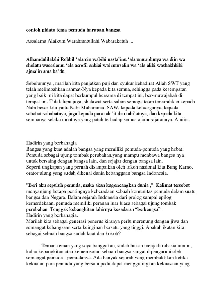 Hal ini akan melestarikan budaya bahasa yang ada di. Contoh pidato tentang generasi muda harapan bangsa terbaru ditulis admin kamis 29 oktober 2020 tulis komentar edit. Contoh pidato yaitu seperti pidato kenegaraan pidato menyambut hari besar pidato pembangkit semangat pidato sambutan acara atau event dan lain sebagainya.