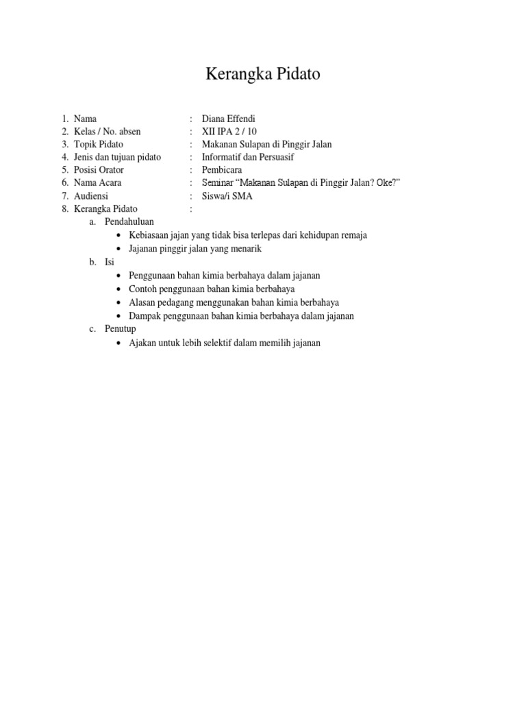 Contoh Pidato Persuasif Tentang Disiplin Jauhi Malas Buatlah kerangka. Ya pidato merupakan suatu ucapan dengan susunan yang baik dan sopan untuk menyempaikan sesuatu hal kepada khalayak. Contoh Kerangka Pidato Perpisahan.