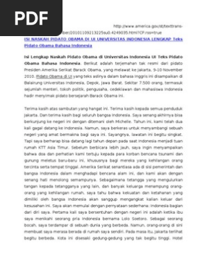 Berikut adalah pidato Presiden Obama yang disalin dari situs resmi gedung putih whitehousegov. Pidato yang teks aslinya dalam bahasa Inggris ini disampaikan di Balairung Universitas Indonesia Depok Jawa Barat. Distinguished teachers brothers and sisters Assalamualaikum Warahmatullahi Wabarakatuh May peace and blessings of Allah be upon all of you.